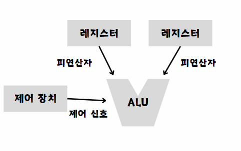 ALU는 래지스터를 통해 피연산자를 받아들이고, 제어장치로부터 수행할 연산자를 알려 주는 제어 신호를 받아 들인다. ALU는 레지스터와 제어장치로부터 받아들인 피연산자와 제어 신호로 산술 연산, 논리 연산 등 다양한 연산을 수행한다.